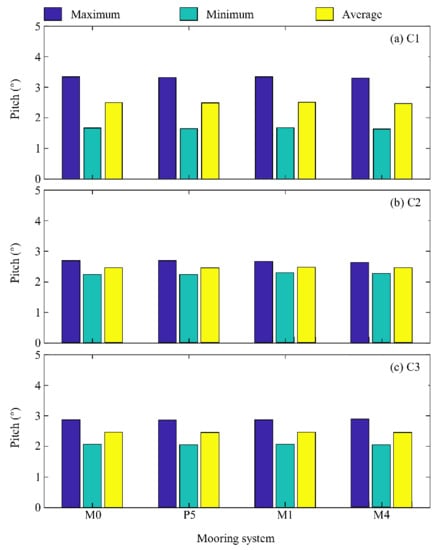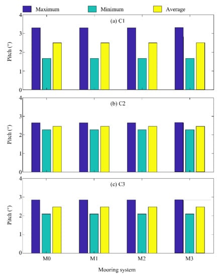 Further, to quantitatively examine the developed mooring system performance, the maximum, minimum, and average values of the pitch movement time series, as shown in Figure 8, are calculated and presented in Figure 9. It can be seen that the average values of the pitch movement time series are almost at the same level for all of the cases, which are not affected by the wave condition and applied mooring system. From Figure 8, it can be seen that the wind turbine moves sinusoidally and regularly in the pitch direction; hence, the difference between the maximum and minimum values in Figure 9 can be roughly regarded as the pitch movement amplitude. From Figure 9, the pitch movement amplitudes are almost at the same level so long as the wave conditions are the same, quantitatively indicating that the wind turbine pitch oscillating movement is mainly resulted by the wave load, which can hardly be controlled by the developed mooring system. When the wave condition varies, the pitch movement amplitude changes also; specifically, the pitch amplitude of C1 is the largest (mean value is equal to 1.63° in M0–3), and the pitch amplitude of C2 is the smallest (mean value is equal to 0.37° in M0–3). Thus, it can be said that the wind turbine pitch oscillating movement amplitude is sensitive to the wave height. The larger the wave height, the higher the wave energy will be, and the larger the pitch oscillating movement amplitude will be.