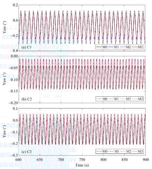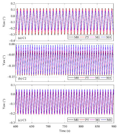 Figure 20 shows the wind turbine yaw movements with different mooring systems (M0, P5, M1, and M4) when under regular waves (C1–3). From Figure 20, it can be directly observed that the wind turbine yaw drifts with M0 are always larger than those with P5, M1, and M4 when under regular waves. The yaw drift with M1 is slightly smaller than that with P5; hence, it can be inferred that using the three-bifurcated sub-mooring-lines could increase the torsional stiffness of the mooring system, and it is more effective in wind turbine yaw vibration controlling compared with attaching a clump mass onto the mooring lines. After attaching a clump mass in M1, M4 performs better than M1 and P5, implying that attaching a clump mass in the developed three-bifurcated mooring system can further improve its resistance ability. Besides, Figure 20 indicates that the surge movement oscillation amplitudes can also be reduced by attaching a clump mass or using three-bifurcated mooring lines, which is consistent with the conclusion drawn in Section 4.2.1. During this process, not only the yaw drift mainly resulted from the wind load is reduced; the yaw oscillation mainly resulted from the wave load is controlled also.