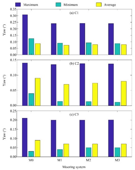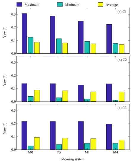 To quantitatively examine the difference between the mooring systems, the maximum, minimum, and average values of the yaw movement time series, as shown in Figure 20, are calculated and presented in Figure 21. When the mooring system varies, the average values of the yaw movement time series change also; specifically, the average value of M0 is the largest (mean value is equal to 0.082° in C1–3), implying the largest wind turbine yaw drift occurs when applying M0. The yaw drifts for P5 and M1 are 0.08° and 0.077°, respectively, implying better yaw movement controlling performance of the developed mooring system using three-bifurcated mooring lines. After applying a clump mass in M1, the yaw drift of M4 further decreases to 0.074°, which reduces 9.8% compared with the original mooring system, and further reduces 3.4% compared with the three-bifurcated mooring system. From Figure 21, the yaw movement amplitudes are also controlled by the mooring systems. In Figure 21a,c, M4 reduces 30.1% yaw amplitude compared with the original mooring system. P5 and M1 reduce 10.7% and 22.3% yaw amplitude, respectively, indicating 11.6% improvement in M1 compared with P5.