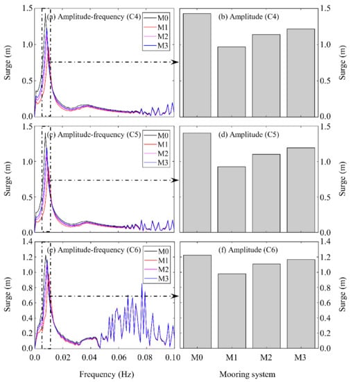 Wind turbine surge movement in frequency domain with M0–3 when under: (a) amplitude-frequency (C4); (b) amplitude (C4); (c) amplitude-frequency (C5); (d) amplitude (C5); (e) amplitude-frequency (C6); (f) amplitude (C6).