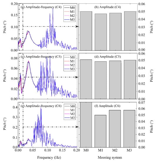 Figure 13 shows the wind turbine pitch movement in the frequency domain with M0–3 when under C4–6. Similar to Figure 12, the left column in Figure 13 presents the wind turbine pitch movement amplitudes corresponding to different frequencies. It is difficult to find the fundamental frequency of the wind turbine pitch movement due to there being many peaks at almost the same high level. To ensure consistency between the surge, pitch, and yaw movements, the pitch amplitudes corresponding to the fundamental frequency of the surge movement are found and presented in Figure 13 (right column). From Figure 13, it can be seen that the wind turbine pitch movement amplitudes have little sensitivity on the applied mooring system, which nearly remain the same as the change of sub-mooring-line length. However, in Figure 13f, it can be seen that the wind turbine pitch movement amplitude decreases after applying the developed mooring system. Specifically, the pitch amplitude with M0 is approximately 0.07°. It reduces to approximately 0.058° when with M3. As the sub-mooring-line length increases, the pitch amplitude decreases further, which is equal to 0.05° when with M1. Although, sometimes, the developed mooring system can control the wind turbine pitch movement (when under C6), the pitch amplitude changes are extremely small in most cases (when under C4 and C5). Consequently, it should be conservatively said that the developed mooring system can hardly control the wind turbine pitch movement.