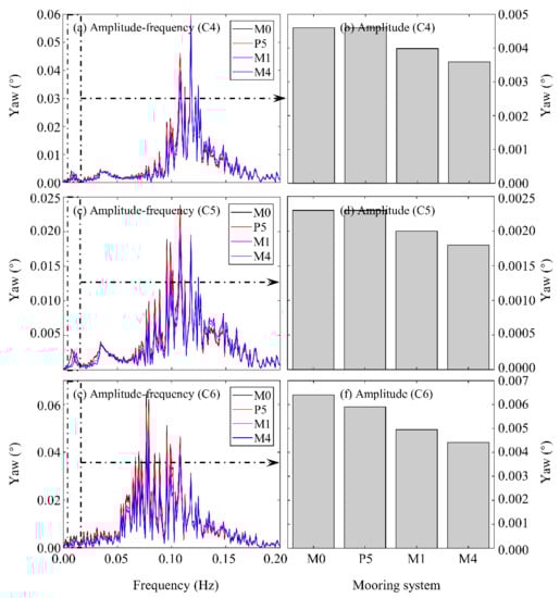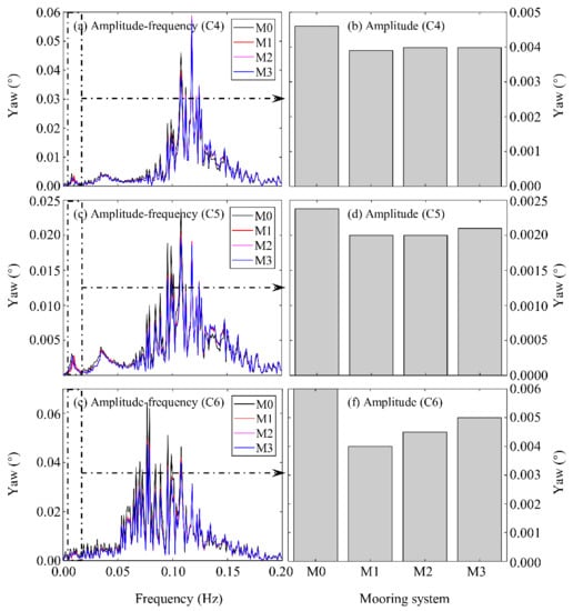 Figure 14 shows the wind turbine yaw movement in the frequency domain with M0–3 when under C4–6. Similar to Figure 12 and Figure 13, the left column in Figure 14 presents the wind turbine yaw movement amplitudes corresponding to different frequencies. Simultaneously, owing to that it is difficult to find the fundamental frequency of the wind turbine yaw movement, to ensure consistency between the surge, pitch, and yaw movements, the yaw amplitudes corresponding to the fundamental frequency of the surge movement are found and presented in Figure 14 (right column). From Figure 14, it can be obviously seen that the wind turbine yaw movement amplitude decreases after applying the developed mooring system. This is consistent with the conclusion attained in Section 4.2.1. Quantitatively, in Figure 14f, the wind turbine yaw amplitude with M0 is approximately 0.006°, which decreases after applying the developed mooring system. The yaw amplitude with M3 is approximately 0.005°, and it is 0.004° when with M1. The M1 developed mooring system reduces the wind turbine yaw movement by nearly 33.33% when under irregular waves, implying well vibration control performance. Besides, for larger frequencies, the corresponding yaw amplitudes also decrease after applying the developed mooring system, supporting the conclusion that the developed mooring system can control the yaw movement again.