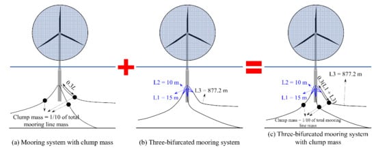 Schematics of the (a) mooring system with clump mass, (b) three-bifurcated mooring system, and (c) three-bifurcated mooring system with clump mass.