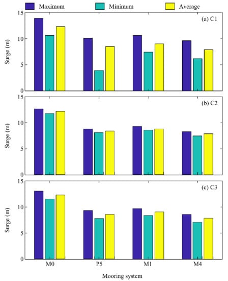 To quantitatively examine the difference between the mooring systems, the maximum, minimum, and average values of the surge movement time series, as shown in Figure 16, are calculated and presented in Figure 17. It can be seen that the average values are almost at the same level for the same mooring system, quantitatively indicating that the wind turbine surge drift is mainly resulted from the wind load, which can hardly be affected by the wave conditions. When the mooring system varies, the average values change also; specifically, the average value of M0 is the largest (mean value is equal to 12.30 m in C1–3), implying the largest wind turbine surge drift occurs when applying M0. For P5, M1, and M4, the largest wind turbine surge drift occurs for M1 (mean value is equal to 8.87 m in C1–3). Next, after applying the clump mass in M1, the wind turbine only drifts 7.73 m in surge direction. It can be said that M4 reduces the surge drift 37.15% compared with M0, and further reduces surge drift 12.85% compared with M1. From Figure 17, the surge movement amplitudes are almost at the same level for the same wave condition, quantitatively indicating that the wind turbine surge oscillating movement is primarily resulted from the wave load, which can hardly be controlled by varying the mooring system.