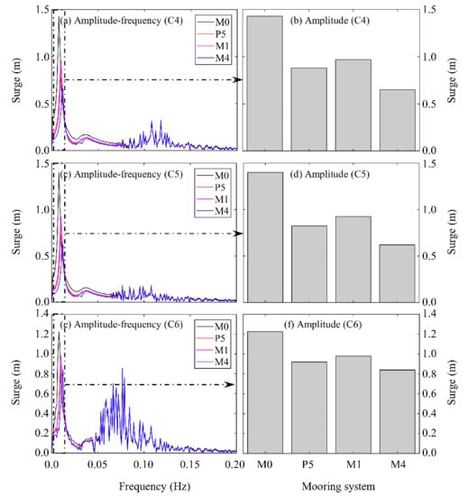 Figure 12 shows the wind turbine surge movement in the frequency domain with M0–3 when under C4–6. The left column in Figure 12 presents the wind turbine surge movement amplitudes corresponding to different frequencies. It can be observed that the fundamental frequency of the wind turbine surge movement is near 0.01 Hz. The right column in Figure 12 presents the wind turbine surge movement amplitudes corresponding to the fundamental frequency. The reason for why only the surge movement amplitude corresponds to the fundamental frequency is that the amplitudes corresponding to the fundamental frequency are significantly larger than those corresponding to other frequencies. This results in the surge movement time series profile being mainly governed by the fundamental frequency. Thus, in this study, only the amplitudes corresponding to the fundamental frequency are studied. From Figure 12, it can be obviously seen that the wind turbine surge movement amplitude decreases significantly after applying the developed mooring system, and the developed mooring system performs best when using the M1 configuration. This is consistent with the conclusion attained in Section 4.2.1. Quantitatively, in Figure 12b, the wind turbine surge movement amplitude with M0 is approximately 1.43 m. The amplitude with M3 is approximately 1.21 m; further, as the of sub-mooring-line length decreases, the amplitude with M1 is approximately 0.92 m. The M1 developed mooring system reduces the wind turbine surge movement by 35.66% when under irregular waves, indicating well vibration control performance.
