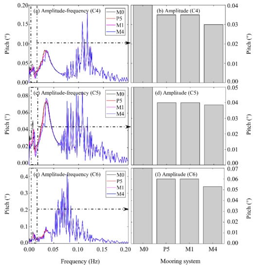Figure 23 shows the wind turbine pitch movement in the frequency domain with M0, P5, M1, and M4 when under C4–6. From Figure 13, it can be seen that the wind turbine pitch movement amplitudes have little sensitivity on the applied mooring system (see Figure 23c). Attaching a clump mass and using the three-bifurcated mooring lines can both hardly reduce wind turbine pitch movement, as concluded in Section 5.2.1. Thus, it can be theoretically inferred that the combined model M4 should show little difference with P5 and M1. However, in Figure 23, M4 is found to be more effective than P5 and M1. This is possibly resulted from numerical error. Totally, the wind turbine pitch movement can hardly be controlled by tuning the mooring system.