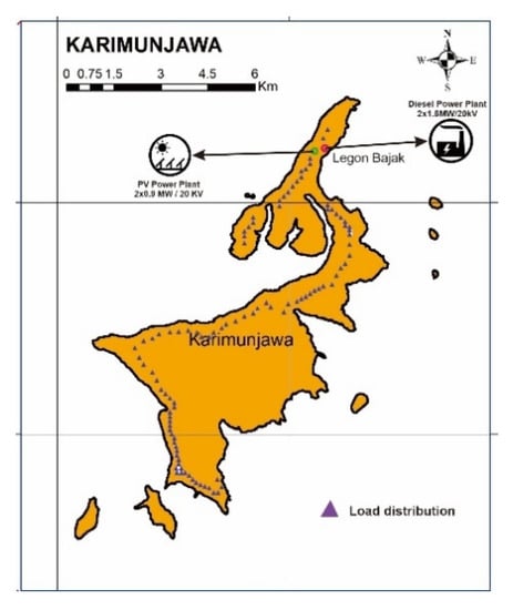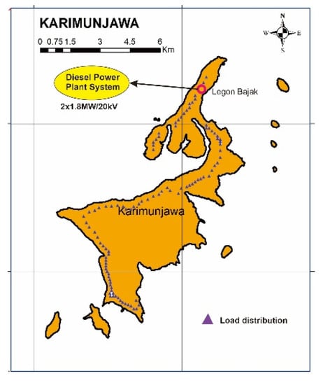 The location of the DPP system is Legon Bajak in the north of Karimunjawa Island [], as seen in Figure 5, with a capacity of 2 × 1.8 MW/20 kV. We have observed daily solar irradiation data on the island of Karimunjawa through visual capture by satellite using the Homer Energy program. We were using linear regression based on data on electricity usage characteristics from 2017–2018.