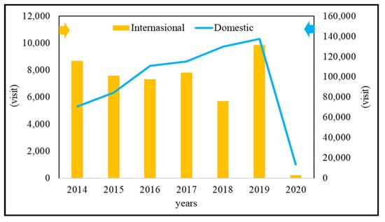 Based on the annual report on tourist visits from The Ministry of Tourism and Creative Economy Indonesia in 2014–2020 [], the number of tourist visits to Karimunjawa Island experienced a positive trend from 2014 to 2019. Then due to the COVID-19 pandemic, there was a negative trend in 2020 (see Figure 4).