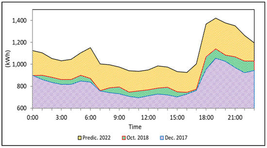 Profile of daily electricity demand on Karimunjawa Island based on observations of daily consumption usage. The average daily electricity demand on Karimunjawa Island was 0.8 MW. The range of electricity consumption in 2017 was 0.7 MW–1.0 MW, and in 2018 it was 0.7 MW–1.1 MW. It can be seen in Figure 10 from the character of electricity consumption from 2017 to 2018. Thus, linear regression can predict that the daily electricity demand in 2022 is 0.9 MW–1.4 MW. Therefore, we propose a PV system to handle the load of 1.4 MW, and the land area for the PV system is calculated using Equation (9). The PV system was planned to produce a power of 0.99 MW. The battery capacity was 3.3 Mah, computed using Equation (4), and Figure 10 also shows the prediction of electricity demand for Karimunjawa Island in 2022, assuming the characteristics of daily electricity use are the same and as planned by the central government, that the increase in electricity demand is targeted at least 11%.