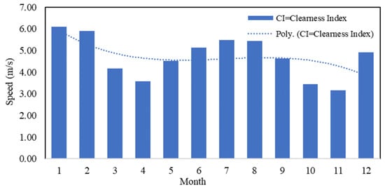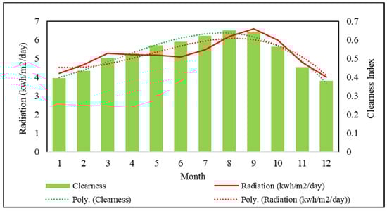 The value of the clearness index (CI) and the radiation value in Figure 10 are displayed in the form of a numerical equation with a polynomial approach shown in Equation (17) with the coefficient of determination (R2) value of 0.967. Meanwhile, radiation is shown in Equation (22), with the coefficient of determination (R2) being 0.756. related to Equations (17) and (19), where the CI is clearness index (%) and Irr(monthly) is monthly solar irradiation (kWh/m2/day), and x is a month (January to December).