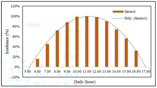 We also capture daily irradiation to determine the characteristics of daily irradiation on Karimunjawa Island in detail. This irradiation value was essential to know the maximum irradiation in one day and the average daily irradiation. Daily capture results from the irradiation from 6:00 to 17:00 are displayed in graphical form in Figure 11. In numerical form using polynomial, we have created the trend equation as shown as Equation (24), where the Irr(daily) is daily solar irradiation (%), and x is an hour with arranging from 5.00 to 17.00. Figure 11 shows that the maximum solar radiation occurs duration in three hours, from 10:00 to 12:00. The average rate from 6:00 to 16:00 was 70%, and this value indicates that the daily solar radiation in Karimunjawa Island.
