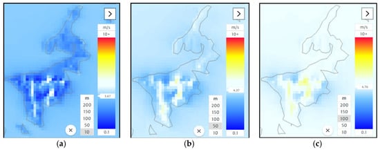 Wind velocity distribution in Karimunjawa Island with a variety of elevations based on global wind altas website (a) 10 m; (b) 50 m; (c) 100 m.