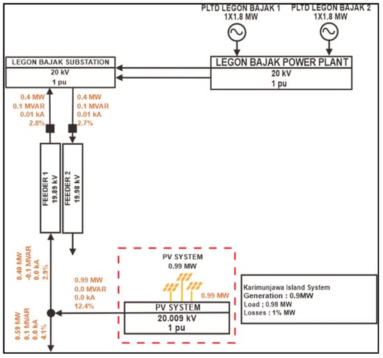 The Karimunjawa Island electricity system is a stand-alone electricity system without interconnection with Java Island, Central Java. Electricity on the island of Karimunjawa is supplied from the DPP Legon Bajak system. The electrical network diagram of the Legon Bajak DPP system is shown in Figure 5. It appears that the DPP system capacity is 2 × 1.8 MW/20 kV to supply power to Feeder 1 (19.87 kV) and Feeder 2 (19.86 kV). The average load is known to be 0.98 MW, with losses of 1.01%.