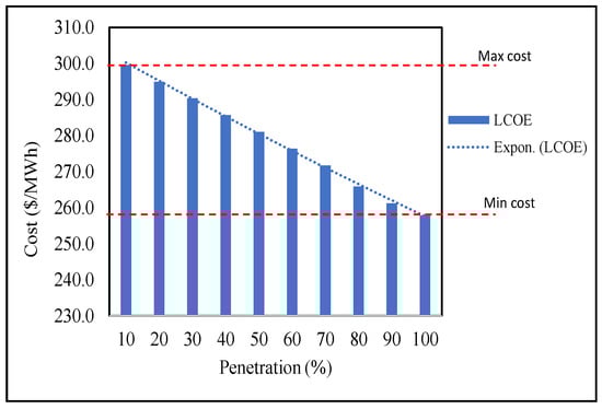 LCOE is calculated using Equation (8) [,], where It is the investment expenditures in year t (including financing). Mt is the operations and maintenance expenditures in a year (t). And Ft is the fuel expenditures in a year (t). It is the electrical energy generated in (t). r is the discount rate, and n is the assumed useful life of the system.