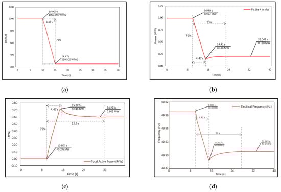 The delay in PV performance degradation caused by blocking from the cloud can be seen through Equation (15) []. Where t is the power drop time from 100% to 25%, PPV is the PV power (watts), is the PV performance drop (%), m is the power drop gradient (MW/s). The value of m is calculated using Equation (16) [], where Vw is the wind speed around PV (m/s), and a is the available PV field area (m2).