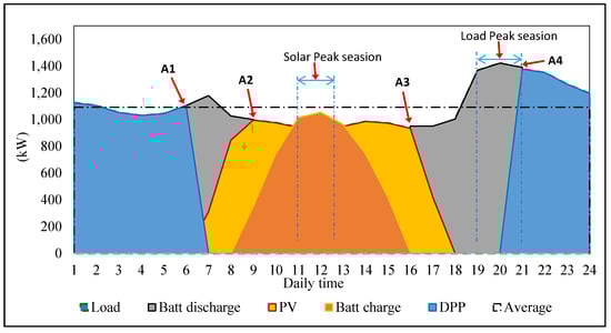 The position allows the PV system to stay close to the DPP system and away from crowds. Utilizing the distribution network that is already available, so there is no need to build a new distribution, certainly saves operational costs. The schematic of the integration of the DPP system and the PV system is shown in Figure 9. It appears that the hybrid system that we proposed is the on-grid model. So the power storage is involved in the power system. The controller module functions as a unit for controlling charging and discharging decisions. When the power output from the PV system has been used enough by the load, the excess power output from the PV system will be used for battery charging. In case of the PV cannot serve the load, the power stored in the battery system is used to supply power to the load system. The energy from the PV system or the battery is converted from DC to AC by the converter module.