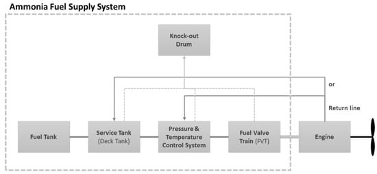 Ammonia is supplied from a fuel tank to an ammonia engine as shown in Figure 1. Ammonia in the fuel tank is provided through a service tank, a pressure and temperature (P & T) control system, and a fuel valve train (FVT). The unburned ammonia in the engine is returned to the service tank or the P & T control system. In the case of the ammonia engine (MAN Energy Solutions—Two Stroke ME-LGIA concept), excessive ammonia should be supplied to the engine for cooling. Thus, some amounts of ammonia are continuously returned from the engine. Liquid ammonia in the fuel tank can be stored in refrigerated, semi-refrigerated, or compressed conditions. The pressure and temperature of refrigerated ammonia are about 1 bara and −33 °C, respectively, whereas those of compressed ammonia are approximately 10 bara and 25 °C, respectively. Refrigerated ammonia is generally used in the case of large capacity due to its high density. Compressed ammonia is commonly used in the case of small capacity because the construction and operation of the compressed ammonia tank are easier than refrigerated ammonia. The service tank acts as a buffer between the fuel tank and the P & T control system. Although the service tank makes the operation easy, it requires additional costs. The function of the P & T control system is to meet conditions (pressure, temperature, and fineness) required by the engine. The P & T control system consists of pumps, heat exchangers, and filters. The FVT is the interface between the P & T control system and the engine to ensure safe isolation of the engine during shutdown and maintenance.