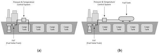 There are two main ways to store ammonia as fuel in the ammonia carrier. When the ammonia is used as fuel, an ammonia storage tank should be installed in the ship (containership, a crude oil tanker, bulk carrier, etc.). However, the cargo (ammonia) can be used as fuel in the case of an ammonia carrier. Figure 2 shows storage concepts for ammonia fuel in an ammonia carrier. The main difference between the two concepts is whether the installation of fuel tanks is needed or not. Ammonia in the cargo tank can be directly supplied to the P & T control system using a cargo pump as shown in Figure 2a and ammonia in the fuel tank can be provided to the P & T control system as presented in Figure 2b. When the cargo tank is simultaneously utilized as a fuel tank, there are no additional costs for the fuel tank. However, the amount of cargo transported is reduced. If a fuel tank is installed, the operation is easy because different storage conditions can be employed. In addition, there is no cargo loss. However, it requires additional costs for the installation of a fuel tank.