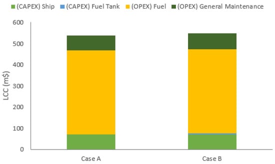 As shown in Figure 3, results of the LCC for the two cases revealed little difference. LCC consists of costs for ship, storage tanks installed additionally (for ammonia fuel), fuel consumption, and general maintenance. There was no difference in ship cost between the two cases. The cost for the storage tanks occurred only for Case B. It was small at 0.8% of the LCC. The fuel consumption cost accounted for about 73.05% of the LCC as shown in Figure 3. Although general maintenance costs for Case B were slightly higher than those for Case A due to additional installation of storage tanks, there was little difference in terms of LCC. The LCCs for Case A and Case B were approximately USD 538.7 million and USD 547.5 million, respectively.