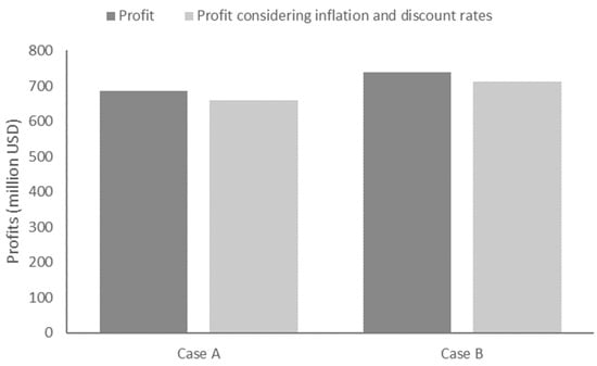 The results of estimating the profits for the two cases showed there was a difference of about USD 64 million in sales and USD 55.2 million in profits as shown in Figure 4. Sales for the two cases were USD 1223 and 1287 million, respectively. Sales for Case B were higher than those for Case A because more ammonia cargo was transported in Case B after the installation of independent fuel tanks. Profits for Case A and Case B were USD 684.3 and 739.5 million, respectively. Profit was estimated by subtracting LCC from sales generated by transporting ammonia as described above. More profit occurred in Case B because increased sales were higher than increased LCC after installing additional fuel storage tanks. The increase in LCC due to installing the additional fuel storage tanks was about USD 8.8 million, but the increase in sales was about USD 64 million. When inflation and discount rates were considered, profits decreased by about 3.8%.