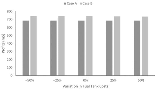 The profit was changed with a 0.3% variation in fuel tank costs only in Case B when fuel tanks were installed. Figure 6 shows profit changes with cost changes of ±25% and ±50% of fuel tanks. There were no changes in profit in Case A because the fuel tank was not installed. Since costs for fuel tanks were 0.8% of the LCC, profits were not significantly changed with the fluctuation in the costs of fuel tanks. Case B equipped with fuel tanks had higher profits than Case A despite a change in the price of the ship.