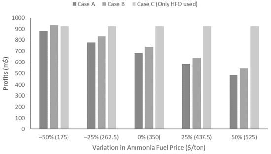 The profits of the ammonia carriers were changed by 15% with a 25% change in the price of the ammonia fuel. Figure 7 shows the changes in profit with changes of ±25% and ±50% in the ammonia price. Figure 7 presents Case A and Case B using ammonia as well as Case C using HFO as fuel for reference. The profit changed impressively with variations in the price of the ammonia fuel. When the price of the ammonia fuel decreased by 50% from the current price, profits were USD 879.5 million in Case A and USD 934.7 million in Case B. When the price of the ammonia fuel increased by 50%, the revenue was USD 489.2 million in Case A and USD 544.4 million in Case B. When the fuel price of ammonia decreased by about 50%, the profit of Case B was higher than that of Case C when conventional HFO was used as fuel. This means that ammonia fuel is competitive from the viewpoint of economics compared to HFO, which is currently utilized as a fuel in ships when the price of ammonia fuel falls by about 50%. Case B with fuel tanks installed had a higher profit than Case A despite a change in the price of ammonia fuel.