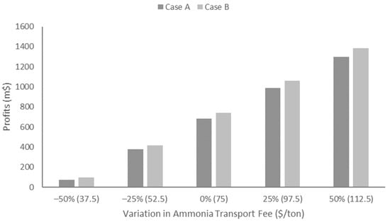 The profit was estimated to compare the two proposed concepts because sales earned by transporting ammonia will be different depending on the concept as mentioned before. In this study, profit was calculated by subtracting the costs required for transporting ammonia from sales. Ammonia transport sales were estimated based on ammonia transport fee, which was assumed to be USD 75/ton [25].