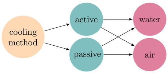 To improve the dissemination and applicability of TEG in waste heat recovery, two paths can be taken. First, as previously described, thermoelectric materials and thus the efficiency of TEG can be increased. Secondly, the thermal system configuration can be improved, which plays a decisive role. One of the important components here is cooling, which can be categorized into active and passive cooling (Figure 1). At first glance, passive cooling [6,7,8,9,10,11] is preferable because it does not affect the electrical net output power. However, since the yield depends directly on the temperature difference, the relatively high thermal resistance of passive cooling has a negative effect on the yield. Active cooling can significantly increase the temperature difference. Nevertheless, this can have a reducing influence on the net electrical output power, since a pressure difference must be built up for active cooling, which in turn consumes electrical power in most cases. At second glance, the net output power can be increased, because in many cases the temperature difference has a stronger positive influence on the net output power, compared to the negative influence of the active cooling. This should be carefully balanced when designing the thermal system of a TEG and this is the main investigation of this review. Obviously, passive cooling offers other advantages over active cooling, such as lower investment costs or higher compactness.
