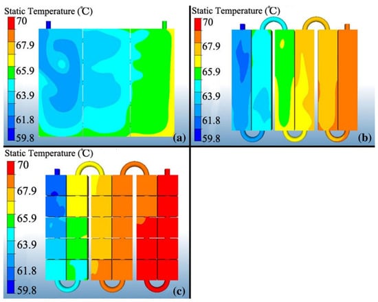 Predicted temperature field of the TEG cooling units: (a) Plate-shaped; (b) Stripe-shaped; (c) Diamond-shaped. Reprint with permission [50]; Copyright 2021, Springer Nature.