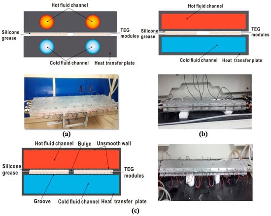 Chen et al. [51] came to the same result for the flow direction. They sandwiched forty TEGs between the hot and cold streams of a two-fluid heat exchanger with maximum temperature difference of 80 K and measured an improvement of 18% when using a co-flow configuration. In the study, three different fluid heat exchangers were investigated, a block with two tubes, a single channel stripe and a single channel stripe with a lower height and with rougher inner surface (Figure 3). The latter outperformed the others by 7% in terms of power output of the TEG, but the associated increase of pumping power was not documented.