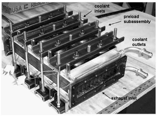 Lee and Lee [82] conducted a study of TEG in combination with printed circuit heat exchanger (PCHE), where minichannels were manufactured by photochemical etching on metal plates with a diameter of 2 mm, to achieve a very compact system. 48 TEG were sandwiched between five PCHEs, two operating with a synthetic organic heat transfer fluid, and three operating with cold water. A maximum net output power of 192.6 W could be obtained experimentally. A computational fluid dynamics (CFD) model was used to determine the thermal resistance and pressure loss (Figure 15). It was found that the maximum net output power was obtained for lower Reynolds numbers, as the difference in the inlet temperatures decreased. The compactness and the low flow rate of the created system was particularly emphasized in this work, in comparison to a simple single conventional channel with the width of one TEG.