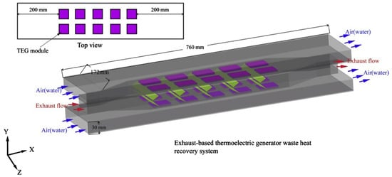- Wang, Y.; Li, S.; Zhang, Y.; Yang, X.; Deng, Y.; Su, C. The Influence of Inner Topology of Exhaust Heat Exchanger and Thermoelectric Module Distribution on the Performance of Automotive Thermoelectric Generator. Energy Convers. Manag. 2016, 126, 266–277. [Google Scholar] [CrossRef]