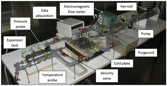 This extra power need of the fan coil, fan and the pipes in a water cycle is analyzed by Aranguren et al. [63,64,65,66,67]. They numerically and experimentally investigated the whole water cycle of a typical TEG waste heat recovery system, consisting of the cooling block, the pump, the fan coil and the fan. The experimental setup is illustrated in Figure 9. Instead of producing electrical power, the system was consuming electrical power in the worst case, when the water mass flow rate was unnecessary high. Therefore the highest net output power was not obtained at the operating point with the lowest thermal resistance of the cooling system. The system produced the highest power when the fan was off and the water cooling pump was working in an optimal manner.