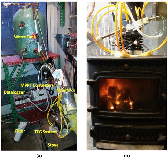 Montecucco et al. [68] conducted a demonstration of technical feasibility of a combined heat and power system (CHP), a solid-fuel stove (Figure 10). The four TEGs in the test rig provided a thermal power of 600 W and an electrical power of 27 W. This implied an efficiency of 5%, where, however, the pump consumption of 8 W was neglected. No optimization was reported, since the author was satisfied with the result, by driving two high-power Universal Serial Bus (USB) devices.