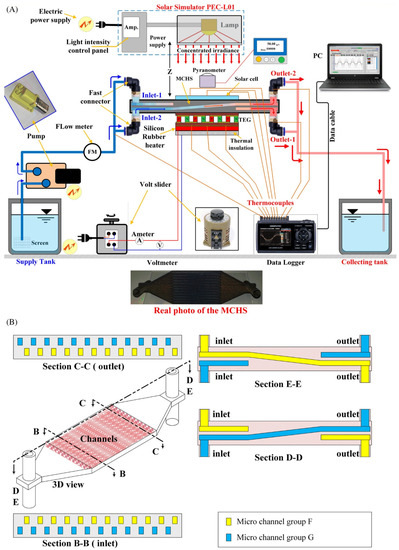 PV microchannel TEG System. Schematic of: (A) the experimental setup; (B) the 3D metal printed microchannel heat exchanger. Reprint with permission [81]; Copyright 2021, JOHN/WILEY & SONS LTD.