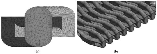Computational mesh of CFD analysis performed by Lee and Lee: (a) Mesh of each channel; (b) Mesh of fluid part at main region of heat exchanger. Reprint with permission [82]; Copyright 2021, Elsevier.