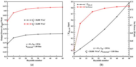 Abd El-Samie et al. [83] created a numerical model to investigate a solar powered TEG cooled by a zigzag microchannel heat exchanger with nanoparticles added to cooling water. The results showed that Reynolds numbers higher than 400 and the nanoparticle concentration had no influence on the output power of the TEG. A Reynolds number of 50 provided the maximum net output power for this system, as can be seen in Figure 16.