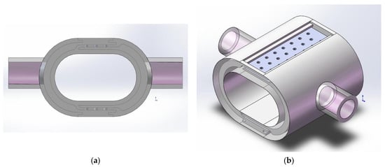 Meander cooling unit with inflow and outflow: (a) Perpendicular to the channel; (b) Parallel to the channel. Reprint with permission [55]; Copyright 2021, Elsevier.