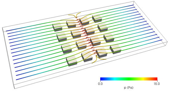 Pfeiffelmann et al. [88,89] reported a new solver within an open source CFD framework to model a TEG and the flow of the heat exchanger at once. Two ingredients of the complete model, i.e., the TEG, and the impingement cooling configuration were, considered separately, first, in order to validate the numerical models in detail, by comparisons with the relevant experiments from the literature. After validating the two parts, they combined both to a coupled model. The results of such a calculation can be seen in Figure 19, where the predicted streamlines of the cooling water flowing over the TEG legs are displayed.