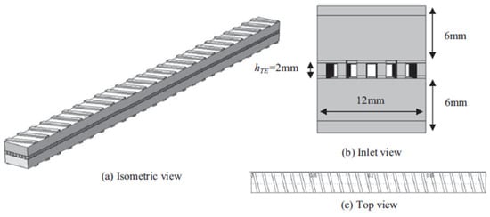 Rezania et al. [74,75,76,77,78,79] studied the cooling of TEG with microchannels intensively. They compared the performance of microchannel and macrochannel heat sink numerically [74]. On one hand, for the arrangement of the same temperature difference between hot and cold surface of the TEG, the macrochannel needed less pumping power. In turbulent flow regime, the required pumping power was about 1.4% of the output power for the macrochannel, whereas this number increased to approx. 10% in the case of microchannel. For the laminar flow, the required pumping powers were much smaller, less than 0.1% for microchannel and less than 0.01% for macrochannel. As seen from this numerical study [74], the use of microchannel or macrochannel does not have a noticeable effect on the pumping power, whereas a slight penalty need to be considered for the microchannel, in the turbulent flow regime. On the other hand, the microchannel heat exchanger needs a lower flow rate, is more compact, and weighs less. They examined the maximum net output power experimentally and found a single maximum, when varying the coolant flow rate [77]. It shifted to lower flow rates when the temperature difference of the TEG surfaces was decreasing. They have studied the effectiveness of the number of microchannels under a TEG numerically, by reducing the number of channels while holding the pressure drop constant [76]. This reduced the velocity in the channel and, the thereby the pumping power. They stated that a small number of channels is sufficient for a TEG, but the inlet plenum needs to additionally be considered in the loss calculation, especially at high pressure drops. The channels were equidistantly distributed under the TEG, also utilizing the space between the legs (gaps). The channels between the legs removed significantly less heat than the channels under the legs [75]. This fact was further investigated by removing the microchannels under the gaps in flow direction and by combining the microchannels to a macrochannel under the gaps perpendicular to the flow direction as shown in Figure 12 [79]. They numerically found out that the maximum net output power with this configuration was the same as before, but obtained at a higher flow rate. In addition, the cost efficiency was also optimized [78]. Both the microchannel heat exchanger geometry and the TEG geometry were varied, and by aiming at a maximum output power, a specific geometry was found. It was also found that there was a unique pumping power, which produced maximum cost performance for the TEG system.