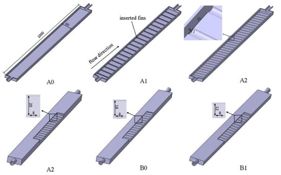 Fin inserts were also used by Zhou et al. [94] who rotated the fins by 60° with respect to the channel to induce a chaotic flow, as depicted in Figure 21. By using the fins, changing the size of the channel from macro to micro-scale and by using nanoparticles, the previous work of Zhou et al. [52] was extended numerically. Due to the fins, the maximum net output power shifts towards the laminar flow regime and thereby to the micro-scale. An improvement of 30% of the net output power could be achieved. The loaded CuO nanoparticles performed superior only in the micro-scale, where the velocity was low, with an improvement of 38% in power generation.
