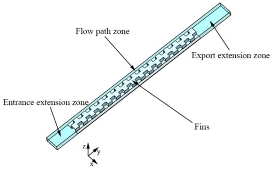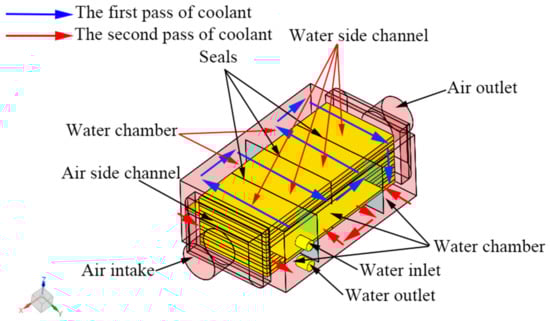 The waterside and airside fins of the water-cooled intercooler studied in this paper are rectangular staggered fins with a fin thickness of 0.2 mm. The structural parameters of the two fins are shown in Table 1. The core part of the intercooler is made of brazing with a size of 300 mm × 120 mm × 110 mm [].