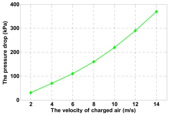 The charge air-side unit body model established based on the above data is shown in Figure 1. The model inlet is set as the velocity inlet and the outlet is set as the pressure outlet, and the intake speed is 2~20 m/s, respectively, with an increment of 2 m/s.