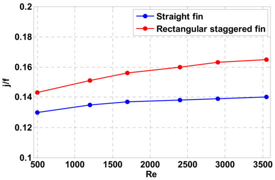 The j/f evaluation factor curve is drawn by taking the simulation data of rectangular staggered fin unit into Equations (4)–(6). The simulation data of flat and straight fins of the same size are introduced to compare the j/f evaluation factors with rectangular staggered fins (Figure 3). With the increase in air velocity, the pressure drop of rectangular staggered fins will be on the increase and the growth rate will increase, but the increase in the convective heat transfer coefficient will slow down, which results in the rapid increase in j/f evaluation factor in the low Reynolds number stage and the relatively gentle increasing trend in the high Reynolds number stage. The average j/f factor of the rectangular staggered fin is 8% higher than that of the straight fin, but the advantage decreases with the increase in high Reynolds number. According to Equation (7), the parameters of the porous medium of the waterside fin and the airside fin can be calculated, as shown in Table 2.