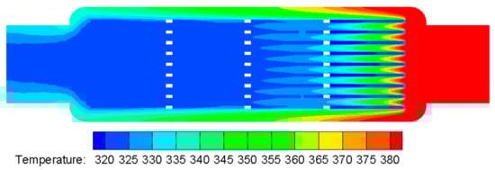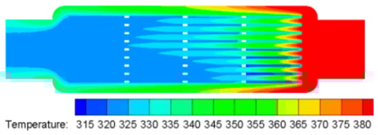 As shown in Figure 6 and Figure 7, the temperature profiles of the central section (XY plane) of the cooler height direction in the single-pass and dual-pass are compared. After the flow heat exchange of the two processes, the temperature of the air outlet of the dual-pass intercooler is lower than that of the single-pass intercooler. The cooling water flows into the intermediate water chamber after passing the first process, and then flows from the intermediate water chamber to the second process to continue the heat exchange with the pressurized air, and finally flows out of the intercooler from the water outlet. The cooling water of the single-pass intercooler flows in a U-shape, directly through baffles, and there is only one flow path for heat exchange between it and pressurized air. However, compared with the double-flow intercooler, the single-flow intercooler has the advantage of pressure drop. Due to the particularity of its structure, the length of its internal cooling water flow channel is doubled, resulting in the cooling water flow rate in its channel being twice that of the single flow, which directly leads to a significant increase in the resistance along the waterside. Therefore, in order to overcome the excessively high waterside pressure drop of the cooler in the dual process, a pump with a larger head is required. There is no obvious difference in the pressure drop on the airside because the structure of the airside heat sink and the fin is the same. Compared with the data for each section extracted by surface weighting, the dual-pass intercooler is 7.5% more than the single-pass intercooler in heat transfer capacity, the temperature drop on the gas side is 4.5 °C higher and the water pressure drop is 24.8% higher than that in the single-pass intercooler. The overall steady state simulation results of the intercooler are shown in Table 4.
