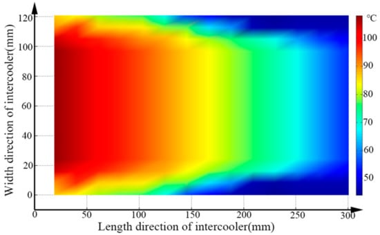 By comparing Figure 8 and Figure 9, it is found that the high-temperature part of the single-pass water-cooled intercooler is mainly concentrated within 120 mm in the length direction, and the second half of the intercooler has a lower temperature and less heat transfer. The difference between the high and low temperature is about 20 °C, and the temperature field is unevenly distributed. The dual-pass heat exchanger has two processes to make the cooling fluid more uniform. By observing the airside temperature field, it is found that the uneven distribution is mainly concentrated near the upper and lower water chambers, which conforms to the heat transfer law. The high-temperature part of the dual-pass intercooler is concentrated within 250 mm in the width direction, which indicates that most of the volume in the intercooler is involved in heat exchange to make the heat exchange more efficient, and the temperature field distribution is uniform compared to the single-pass intercooler. The waterside temperature field distribution of single-pass and double-pass intercoolers can be established according to the same method, and the temperature difference field distribution of waterside intercoolers can be obtained by using the difference between the waterside temperature field and the gas-side temperature field. According to Equations (9) and (10) [], the uniformity factor of temperature field is calculated. The uniformity factor of the temperature field of the single-pass intercooler is 0.975, and that of the dual-pass intercooler is 0.989. The uniformity of the temperature difference field in the dual-pass is higher than that in the single-pass, so the heat exchange effect of the dual-pass intercooler is better than that of the single-pass intercooler. The uniformity of the temperature difference field of the dual-pass intercooler is higher than that of the single-pass radiator, therefore the heat transfer effect of the dual-pass intercooler is better than that of the single-pass intercooler.
