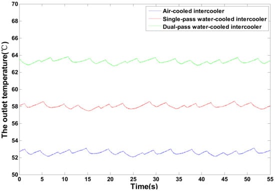 The thermal equilibrium temperatures during working conditions is shown in Table 5. There is a significant difference between the test value and the simulation value, but the overall deviation is less than 10%. Although the intake air temperature of water-cooled and air-cooled intercoolers are within the normal range under both operating conditions, the heat-exchange performance of water-cooled intercoolers is better because the average outlet temperature of pressurized air of water-cooled intercoolers is about 10 °C lower than that of air-cooled intercoolers. If a transporter equipped with a two-process water-cooled intercooler is used for the test, the intake air temperature can be controlled to within 50 C, which will greatly reduce the NOx and soot emissions of the engine and improve the engine power performance to a certain extent [].