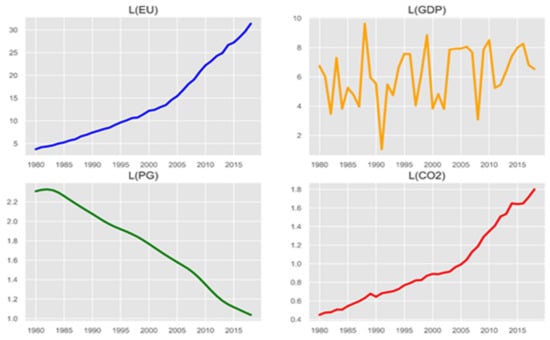 This section describes the summary of the descriptive statistics of the variables before the logarithmic transformation was applied. The study variables after logarithmic transformation are shown in Figure 1. Population growth decreases consistently, the trend of energy use follows the trend of CO2 emissions, but there appear to be trend fluctuations in GDP.