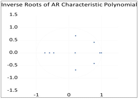 Figure 2 indicates the inverse roots of the characteristic polynomial. The roots characteristic polynomial is used to check the stability of the VECM. The vector error correction specifications impose one unit-root outside the unit circle (Eigen statistics of the respective matrix is exactly one or less); hence, the model satisfies the vector auto-regressive (VAR) stability conditions, and the VECM is acceptable in a statistical sense to make inferences.