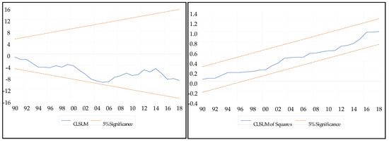 The null hypothesis of no cointegration among variables is tested by the joint significance using F-statistics. If the F-statistics value turns out to be greater than the upper critical value provided by Pesaran et al. (1999), the null hypothesis of no cointegration is rejected and we conclude that there exists a long-term relationship between the variables. If the F-statistics value is less than the lower bound, then we fail to reject the null hypothesis of cointegration. However, if it is between the lower and upper bounds, then the decision remains inconclusive, which can be clarified using Johansen’s test cointegration [45] or by checking the cointegration space constancy using the cumulative sum of recursive residuals (CUSUM) and cumulative sum of the square of recursive residuals (CUSUMsq), respectively [46].